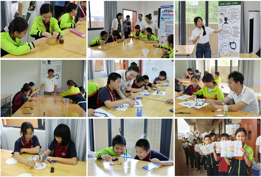 在动手实践环节,同学们分组完成了三个趣味实验:碘伏实验(认识络合反应和氧化还原反应)、碱水粽实验(测试酸碱性并观察糯米变色)、石墨实验(探究导电性)。每完成一项实验,同学们即可加盖打卡印章,现场气氛热烈。下午场则根据上午的反馈进一步优化了互动方式。整个实践环节中,同学们不断主动向老师请教实验原理,探索热情溢于言表。