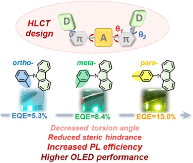 2021年,该研究团队我们通过调节苯环上电子供体基团(D)和受体基团(A)的邻、间、对取代位置,构建了三个D–π–A–π–D结构的异构体o-2CzBT,m-2CzBT和p-2CzBT。研究结果发现,随着取代位置从邻位、间位到对位的变化,空间位阻的降低导致D和A之间的扭转角减小,从而使得振子强度增加。对位取代的p-2CzBT具有更局域激发的成分,该成分引起更快的辐射衰减,从而导致荧光效率高于邻位和间位取代的o-2CzBT和m-2CzBT。正如预期的那样,基于p-2CzBT发光材料的非掺杂和掺杂的OLED器件的外量子效率(EQE)分别达到12.3%和15.0%,这也是目前报道的基于HLCT的OLED器件最高效率。