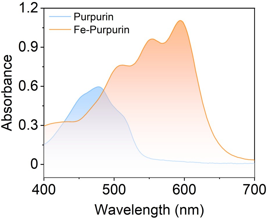 图2 Fe-Purpurin和配体Purpurin的紫外可见吸收光谱对照图