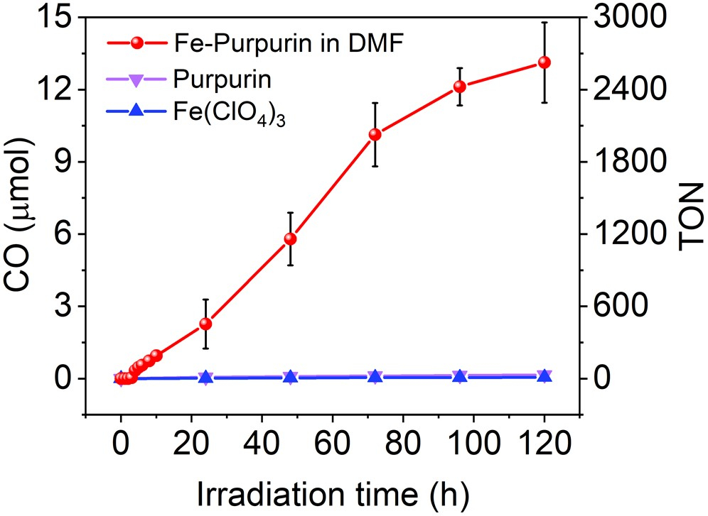 近日,williamhill中国韩治际教授课题组报道了一种有机染料(Purpurin)与廉价金属铁配位的分子光催化剂用于均相光催化二氧化碳还原(图1)。在前期的研究中,该课题组设计合成了一种新型的金属-有机染料光敏剂(Cu-Purpurin)提高光敏剂的还原性能,促进光催化二氧化碳还原(Nat. Commun. 2021, 12, 1835), 虽然Cu-Purpurin也能用作光催化二氧化碳还原的光催化剂,但稳定性较差,在可见光下光照一个小时体系就基本上失去了活性。在此基础上,该课题组又设计合成了Fe-Purpurin,同时发现在不额外添加光敏剂或催化剂时也具有催化二氧化碳还原的性能,并且稳定性高达120 h。该系统在450 nm的LED灯源下光照时,光催化CO2还原为CO的选择性达到91%(CO vs H2),可实现超过2625的转换数(图3)。