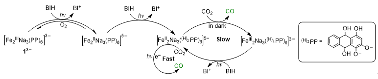 根据原位紫外可见吸收光谱,电化学以及光谱电化学研究表明,可能存在如图4的催化机理,[FeIII2Na3(PP)6]3-在450 nm灯源下激发,同时被BIH还原为[FeII2Na3(PP)6]5-,在有氧气存在条件下,该物种又能被氧化为[FeIII2Na3(PP)6]3-。进一步光照[FeII2Na3(PP)6]5-,配体PP上的羰基被质子化变成羟基,得到[FeII2Na3((H)2PP)6]5-物种,在进一步的光照作用下,该物种快速地将CO2还原到CO。同时发现该物种在黑暗条件下也能缓慢地将CO2还原为CO,自身被氧化为[FeIII2Na3((H)2PP)6]3-。[FeIII2Na3((H)2PP)6]3-在光照条件下又能被BIH还原回到[FeII2Na3((H)2PP)6]5-。这项工作为设计多功能光催化剂提供了一种新的思路。