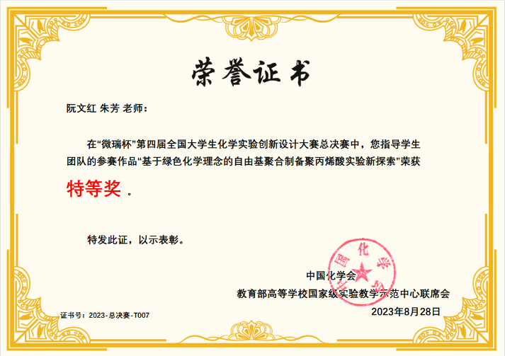 2023年8月20-23日, “微瑞杯”第四届全国大学生化学实验创新设计大赛总决赛在浙江大学举行,我院阮文红、朱芳两位教授共同指导本院2021级本科生赵子健、史延新、李世成参赛并荣获总决赛特等奖,获奖作品为“基于绿色化学理念的自由基聚合制备聚丙烯酸实验新探索”。