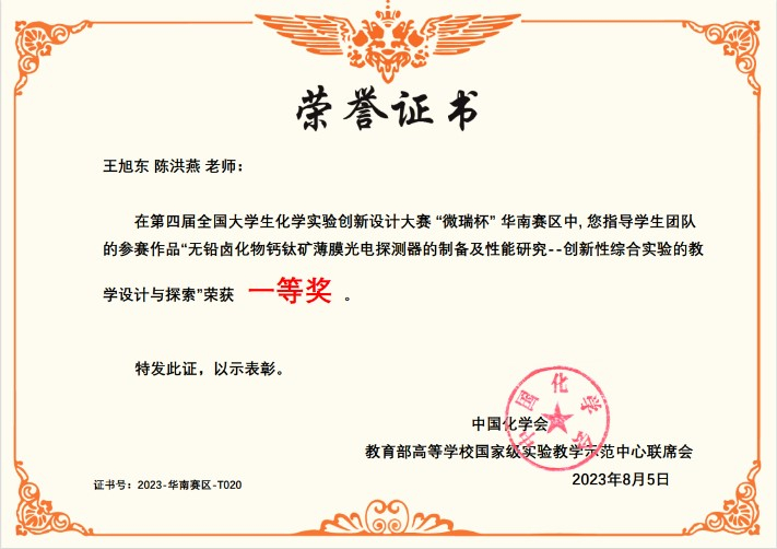 在华南赛区竞赛中,我院选送的三个作品均获得一等奖,分别为:改进实验作品《基于绿色化学理念的自由基聚合制备聚丙烯酸实验新探索》(指导教师:阮文红、朱芳;队员:赵子健、史延新、李世成)、新创实验作品《无铅卤化物钙钛矿薄膜光电探测器的制备及性能研究--创新性综合实验的教学设计与探索》(指导教师:王旭东、陈洪燕;队员:房俞创、魏维、余静怡)以及科普实验作品《烧杯中的彩虹——从化学发光探寻分子的奥秘》(指导教师:潘梅、鲁玉麟;队员:闫翔涵、张锦涛、张婉婧)。因赛制规定每校仅能推荐一项作品参加全国总决赛,根据赛事遴选规则,由改进实验作品代表我校参加总决赛。在总决赛中,该作品在全国90项参赛作品中脱颖而出,荣获全国总决赛特等奖。