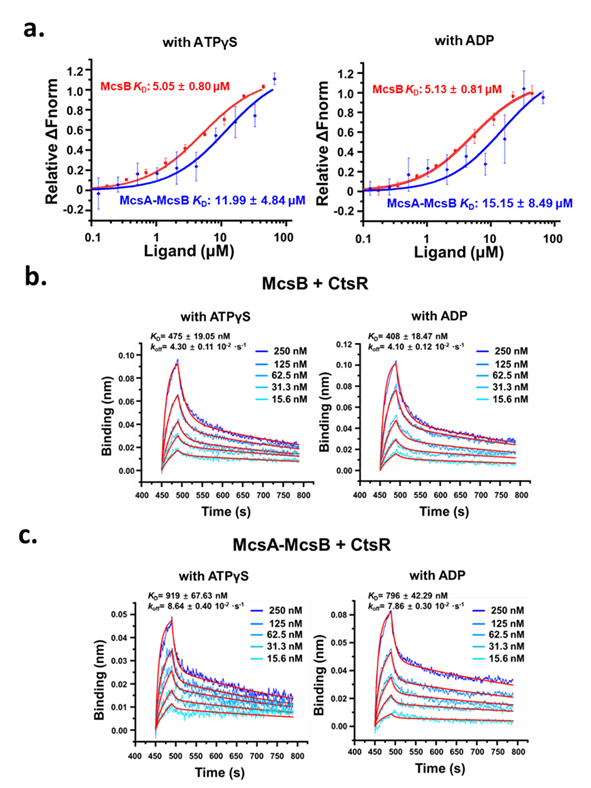图3. McsA降低底物CtsR和McsB的结合亲和力。a. 在1 mM ATPγS或ADP存在下,McsB和McsA-McsB复合物与CtsR相互作用的微量热涌动曲线;b, c. 在1 mM ATPγS或ADP存在下,McsB(b)和McsA-McsB复合物(c)与CtsR相互作用的生物层干涉曲线。
