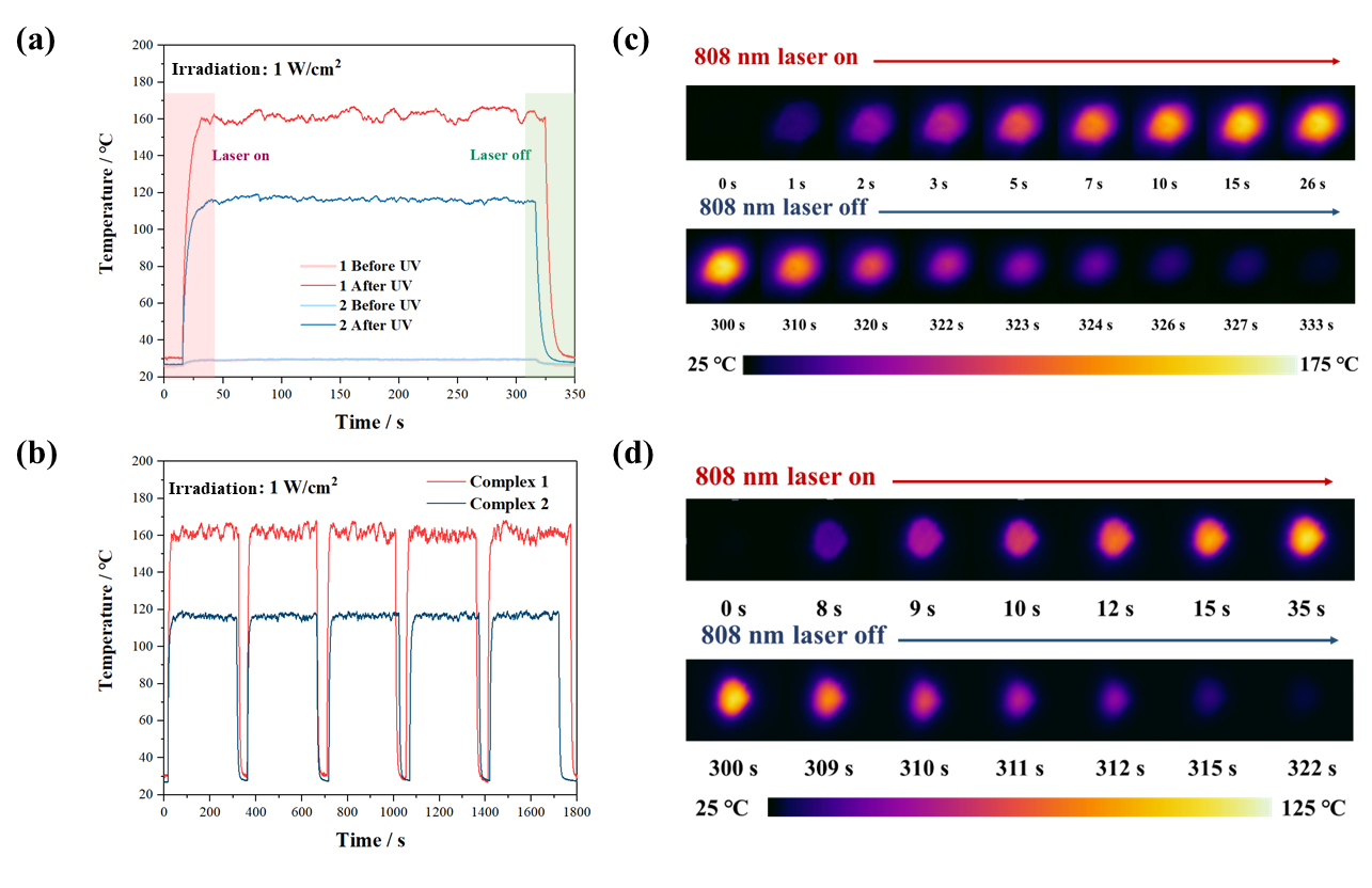 图3. 辐照产物MOF-1*和MOF-2*的光热转换曲线 (a) 以及五次加热-冷却循环测试曲线 (b);MOF-1* (c) 和MOF-2* (d) 在功率为1 W cm-2的808 nm激光辐照下的红外热成像图。