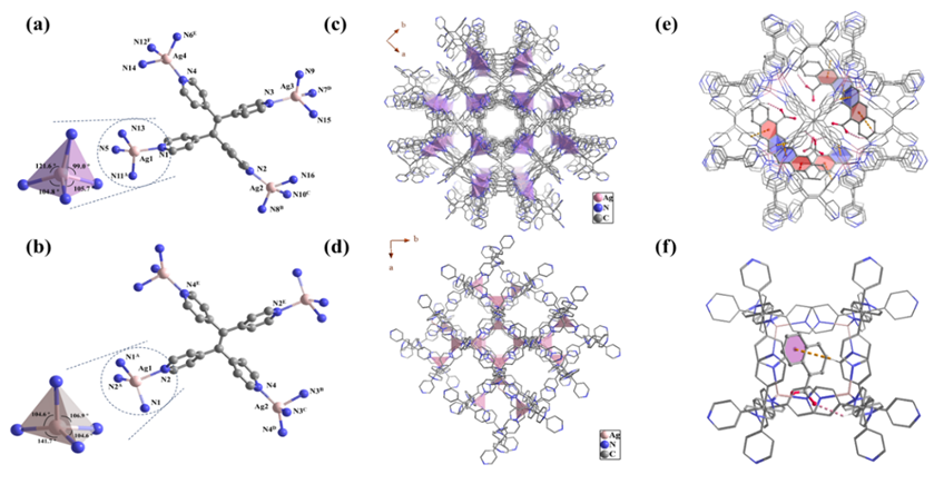 图1. MOF-1 (a) 和MOF-2 (b) 中Ag(I)的配位结构示意图;MOF-1 (c) 和MOF-2 (d) 沿c轴方向三维堆积结构示意图;MOF-1 (e) 和MOF-2 (f) 中阳离子主体框架与阴离子客体之间的相互作用示意图。