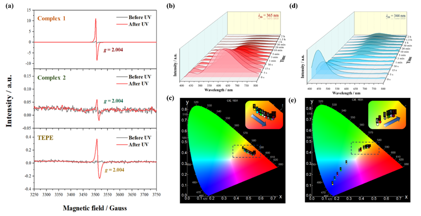 图2. (a) MOF-1和MOF-2以及自由TEPE配体的固态EPR谱图;MOF-1的时间依赖荧光发射光谱 (b) 及其CIE坐标变化轨迹示意图 (c);MOF-2的时间依赖荧光发射光谱 (d) 及其CIE坐标变化轨迹示意图 (e)。