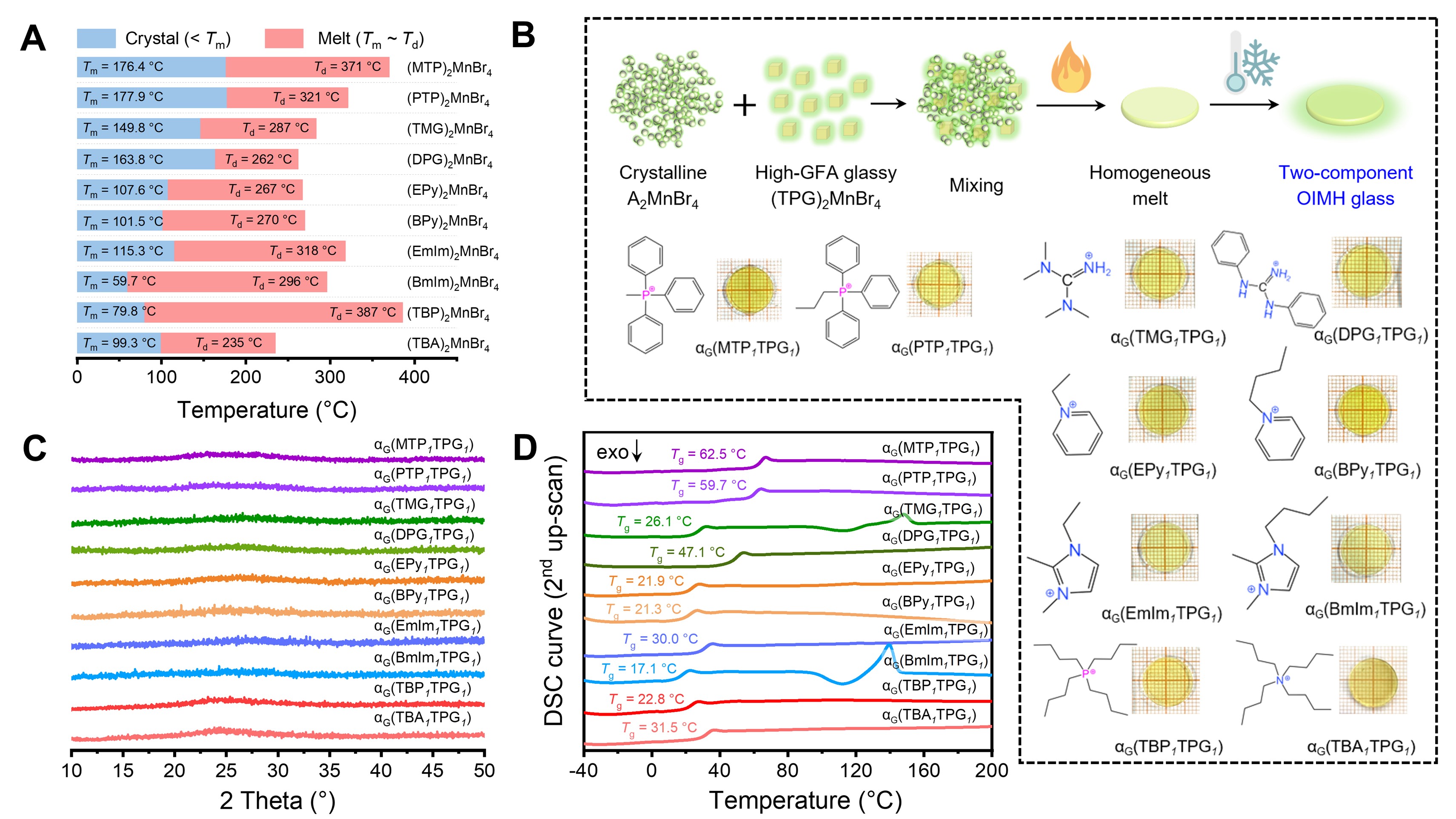 图1. 双组份有机-无机杂化金属卤化物玻璃的制备和结构、热力学特性表征。