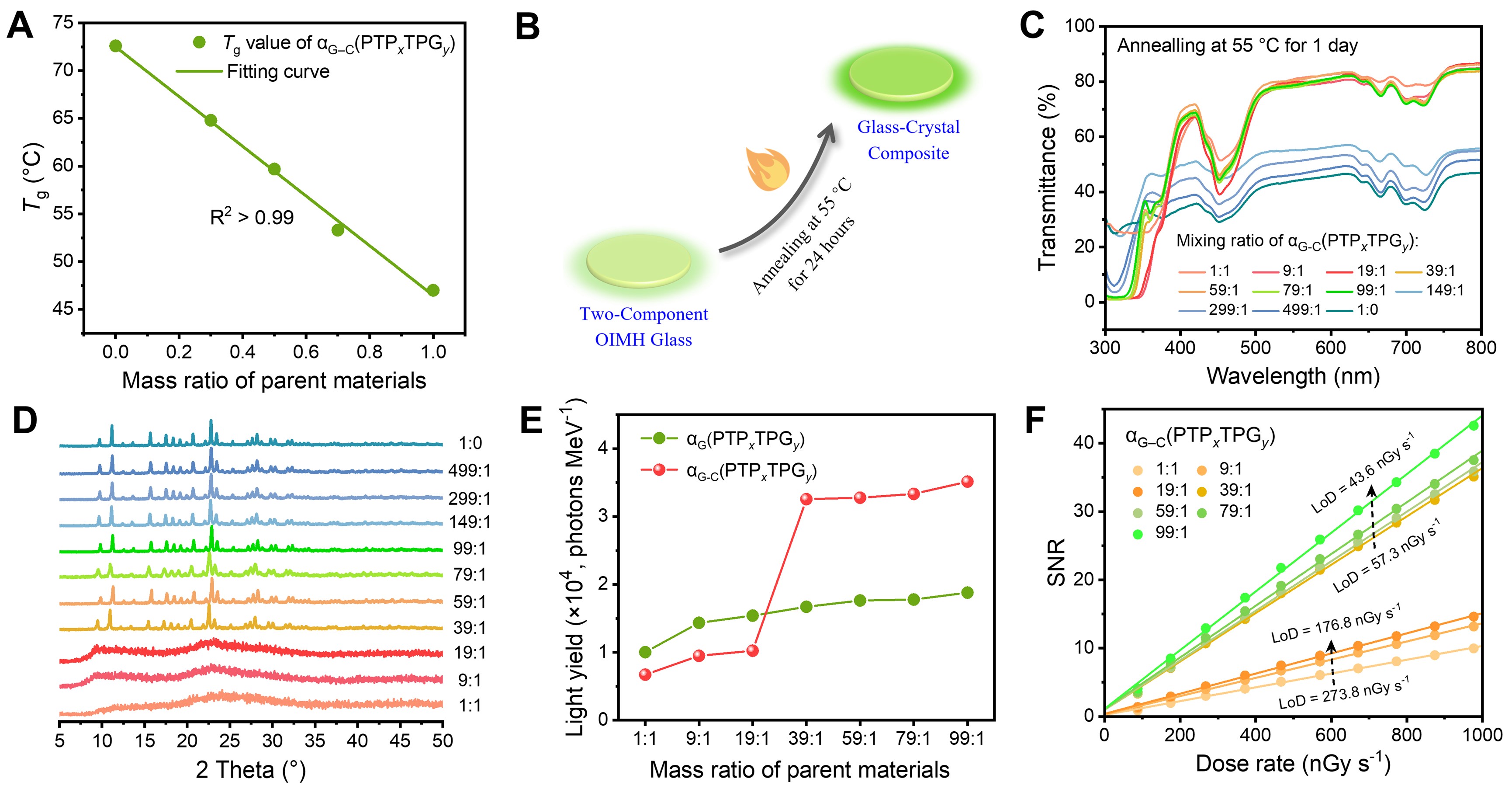 图2. 双组份有机-无机杂化金属卤化物玻璃的原位结晶和闪烁性能优化。