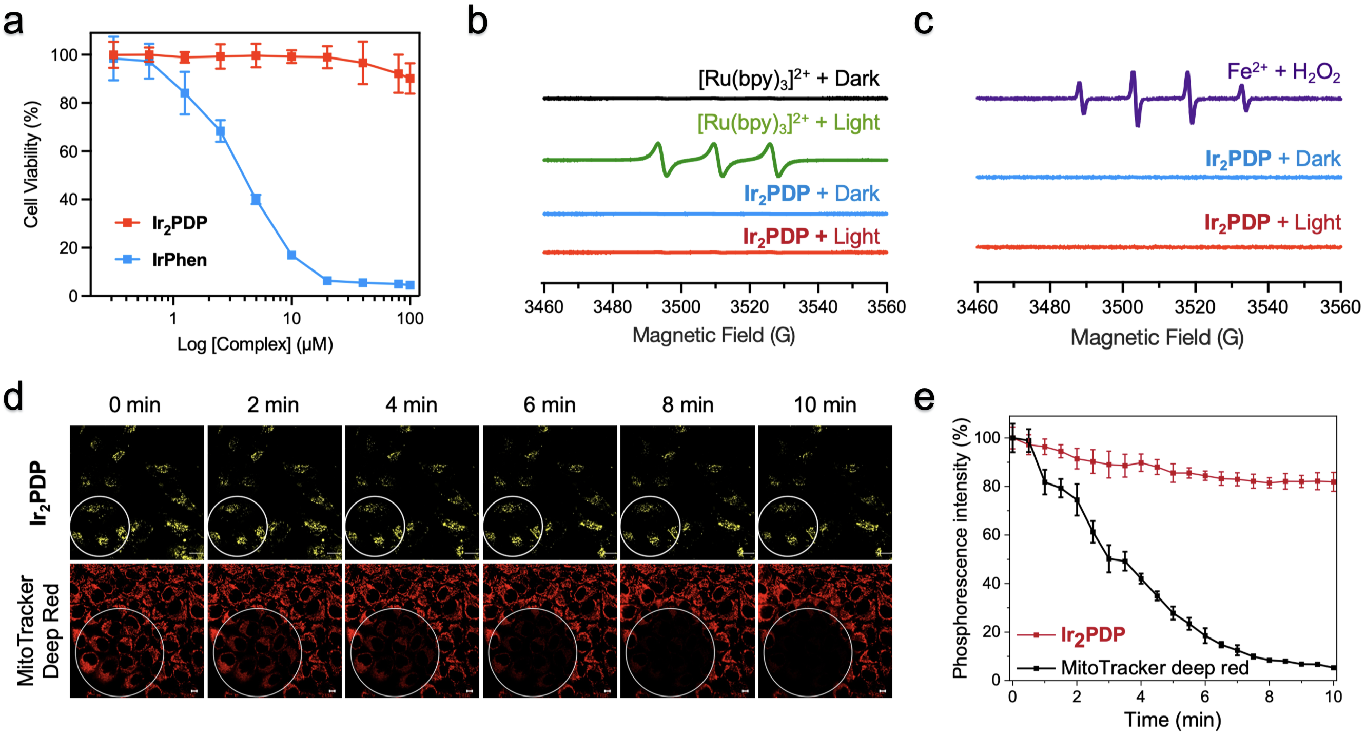 图3. (a) Ir2PDP和IrPhen在不同浓度下的48小时细胞存活曲线。(b) (c) 光照/黑暗条件下Ir2PDP的EPR检测结果。(d) (e) Ir2PDP抗光漂白检测。