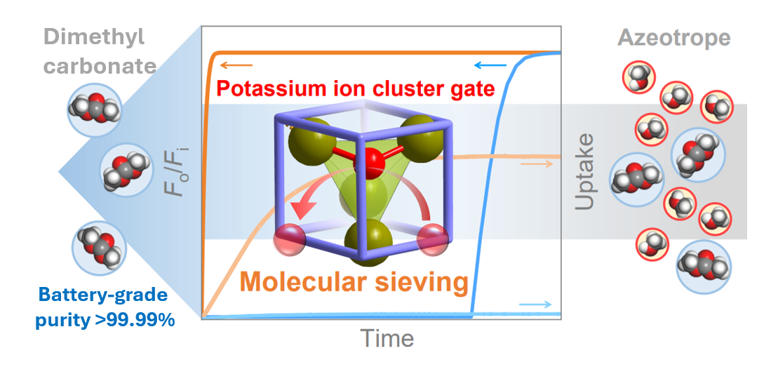 图1. 钾离子簇门控实现MeOH/DMC共沸物的分子筛分,生产出电池级的DMC示意图
