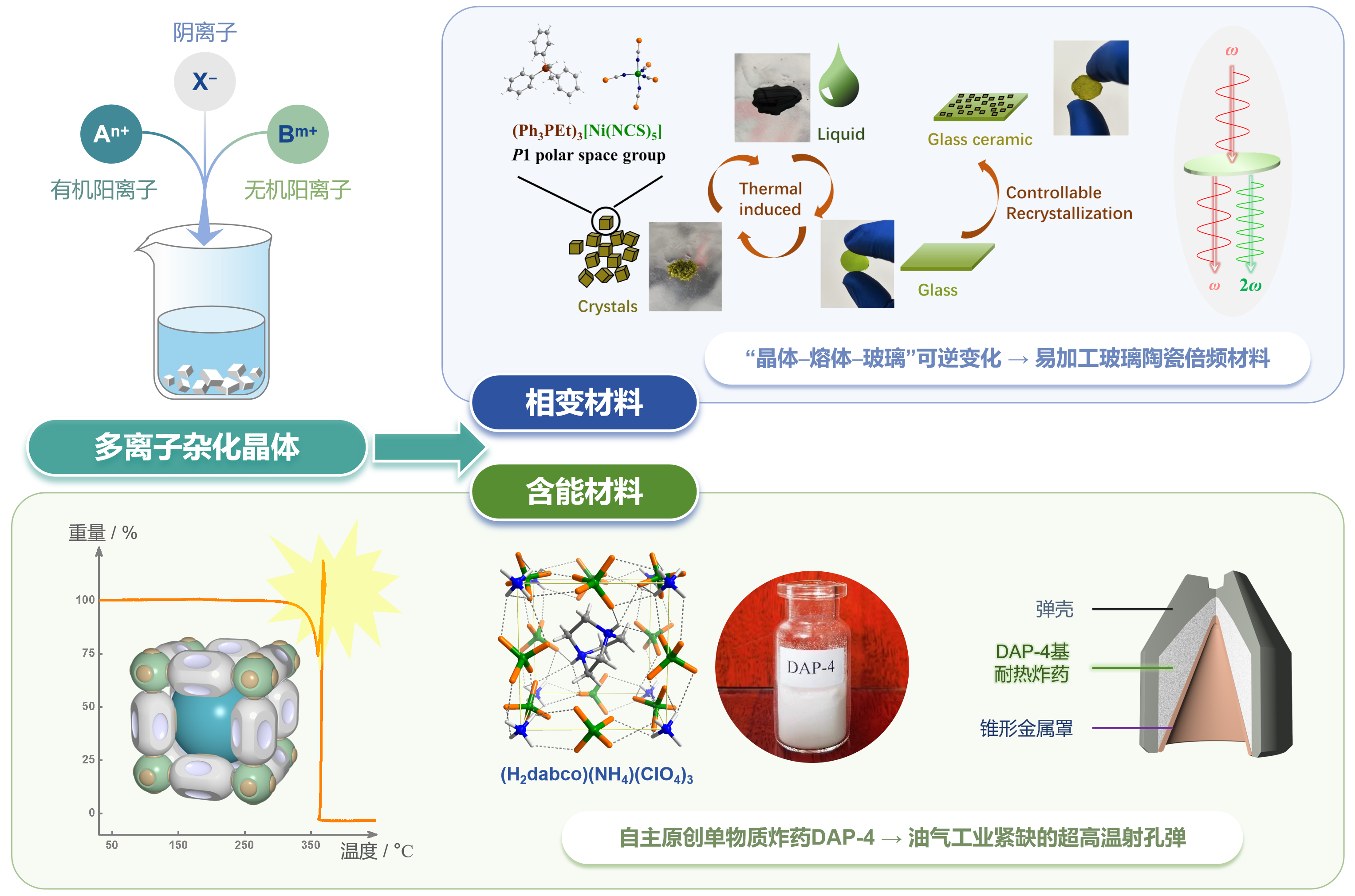 多离子杂化晶体组装及其新材料开发。兼合“有机阳离子-无机阳离子-阴离子”定向设计与可控组装,发展离子间协同调控方法开发多离子集成材料。前期主攻高性能杂化铁电体、易加工玻璃陶瓷倍频材料等,期间发现并系统研究高能、稳定、易规模化制备、具有重大军民两用潜力的多离子集成含能材料(如高氯酸铵三乙烯二铵DAP-4);通过建立其“赋能创制 - 按需调控 - 应用转化”全链条研究体系,为含能材料研究领域开辟了新方向。以第一发明人获国内外授权发明专利20余件;已发表论文160余篇,引用~1.2万次,H指数58。 Researcher ID: D-3365-2011 (https://www.webofscience.com/wos/author/record/D-3365-2011)