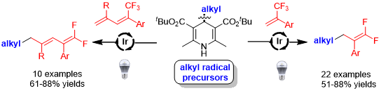 Photoredox Defluorinative Alkylation of 1-Trifluoromethyl Alkenes and 1,3-Butadienes with 1,4-Dihydropyridines as Alkylation Reagents.