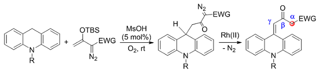 Acid-catalyzed oxidative cross-coupling of acridans with silyl diazoenolates and a Rh-catalyzed rearrangement: two-step synthesis of γ-(9-acridanylidene)-β-keto esters.