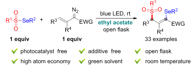 Visible-light-driven radical 1,3-addition of selenosulfonates to vinyldiazo compounds.