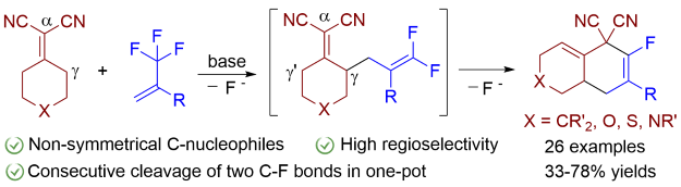 Base-Mediated Regioselective [3 + 3] Annulation of Alkylidene Malononitriles with Trifluoromethyl Alkenes via Dual C-F bond Cleavage.